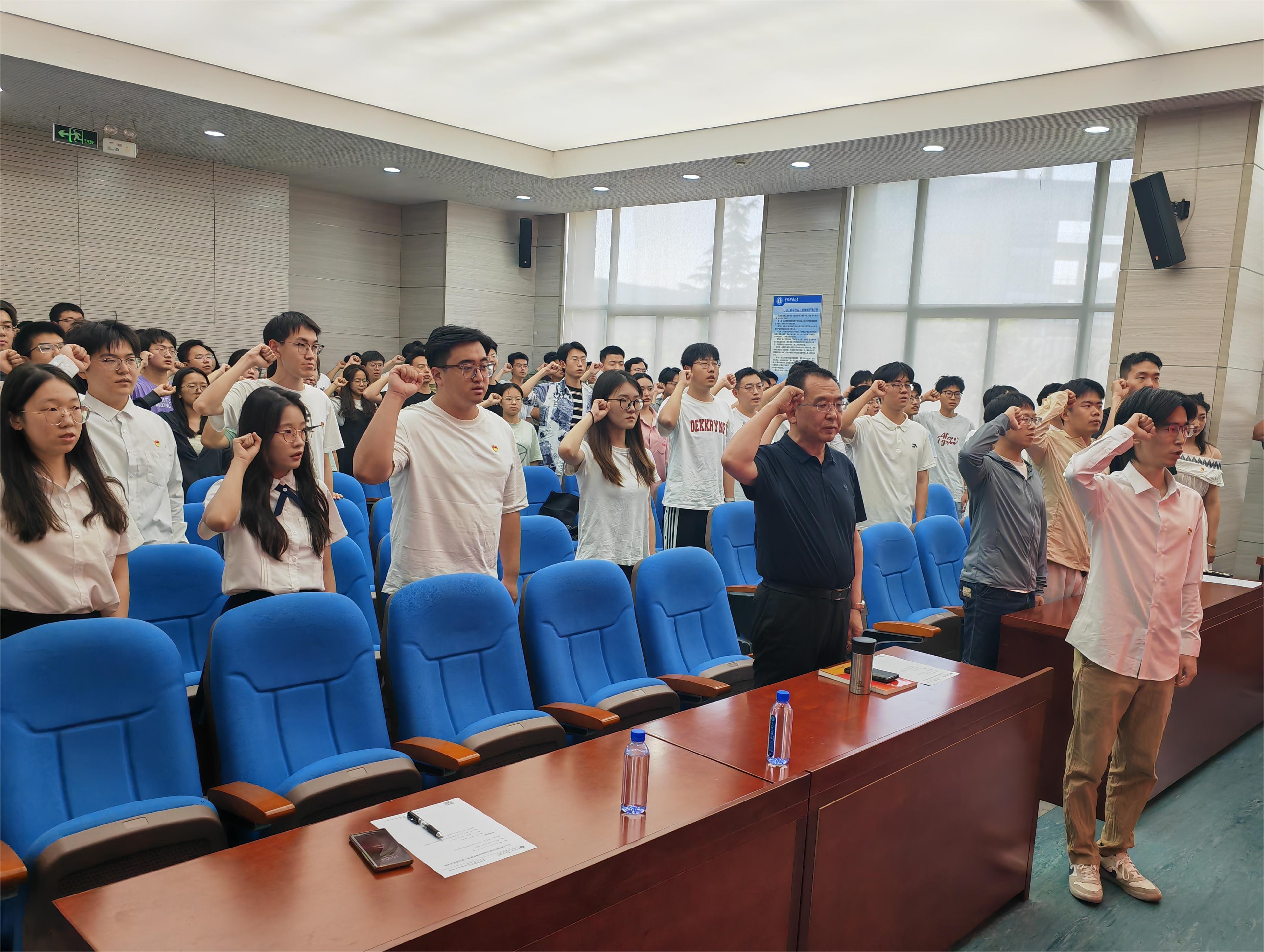 党课在激昂的国歌声中拉开帷幕。王恩元书记为新转正党员颁发《党员政治生日贺卡》,全体与会党员在党员代表俞嘉濠的带领下高举右拳、面对党旗,进行新党员入党宣誓和老党员重温入党誓词仪式。