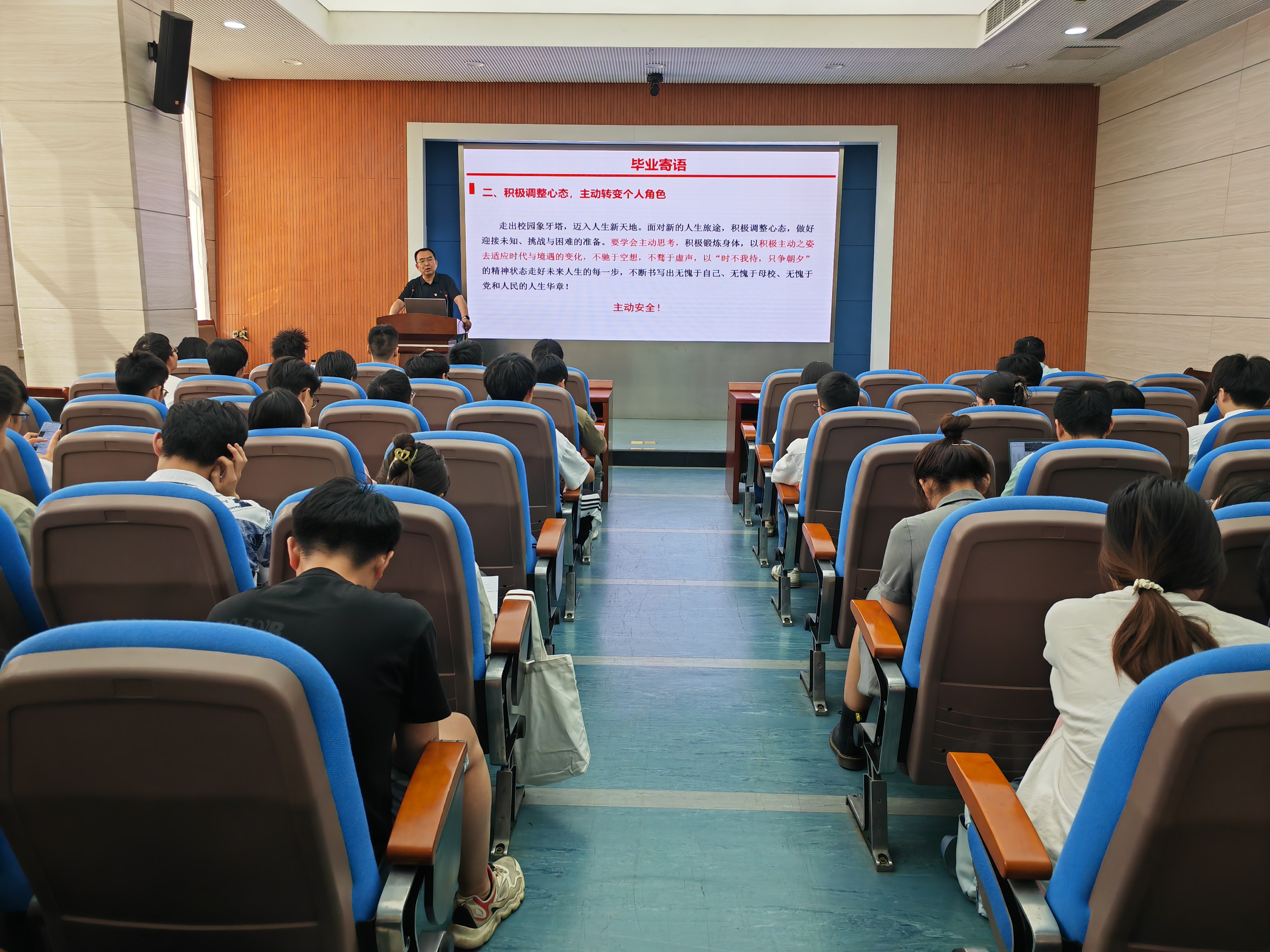 接着,王恩元书记从大学收获、计划目标、党员要求、毕业寄语等四个方面展开讲解。他结合学院学科发展历史、师资情况、科研平台、人才培养等方面带领毕业生党员回顾矿大求学经历以及个人成长收获。通过分析学院近五年毕业生就业去向,他鼓励毕业生党员要脚踏实地,合理制定目标定位,不断在干事创业的实践过程中锤炼过硬本领,努力成为知识与技能兼备的复合型人才。他要求党员要守初心、有信念,牢记党员身份;讲原则、守底线,永葆政治本色;干实事、担责任,争做模范先锋;他结合自身体会和思考,对毕业生党员提出四点希望,一要坚定理想信念,自觉遵纪守规,在专业领域和工作实践中不断攻坚克难,以实际行动践行党员的责任和担当;二要积极调整心态,主动转变个人角色,以积极主动之姿去适应时代和岗位的变化,以“时不我待,只争朝夕”走好未来人生的每一步;三要加强专业自信,树立终身学习理念,始终保持一流的专业自信,增强一流的意识,充满一流的干劲,展现一流的风貌,继续保持学习状态,不断蓄满青春正能量;四要常怀感恩之心,勇担时代重任,用自己的实际行动回报社会、回报母校、回报家人。