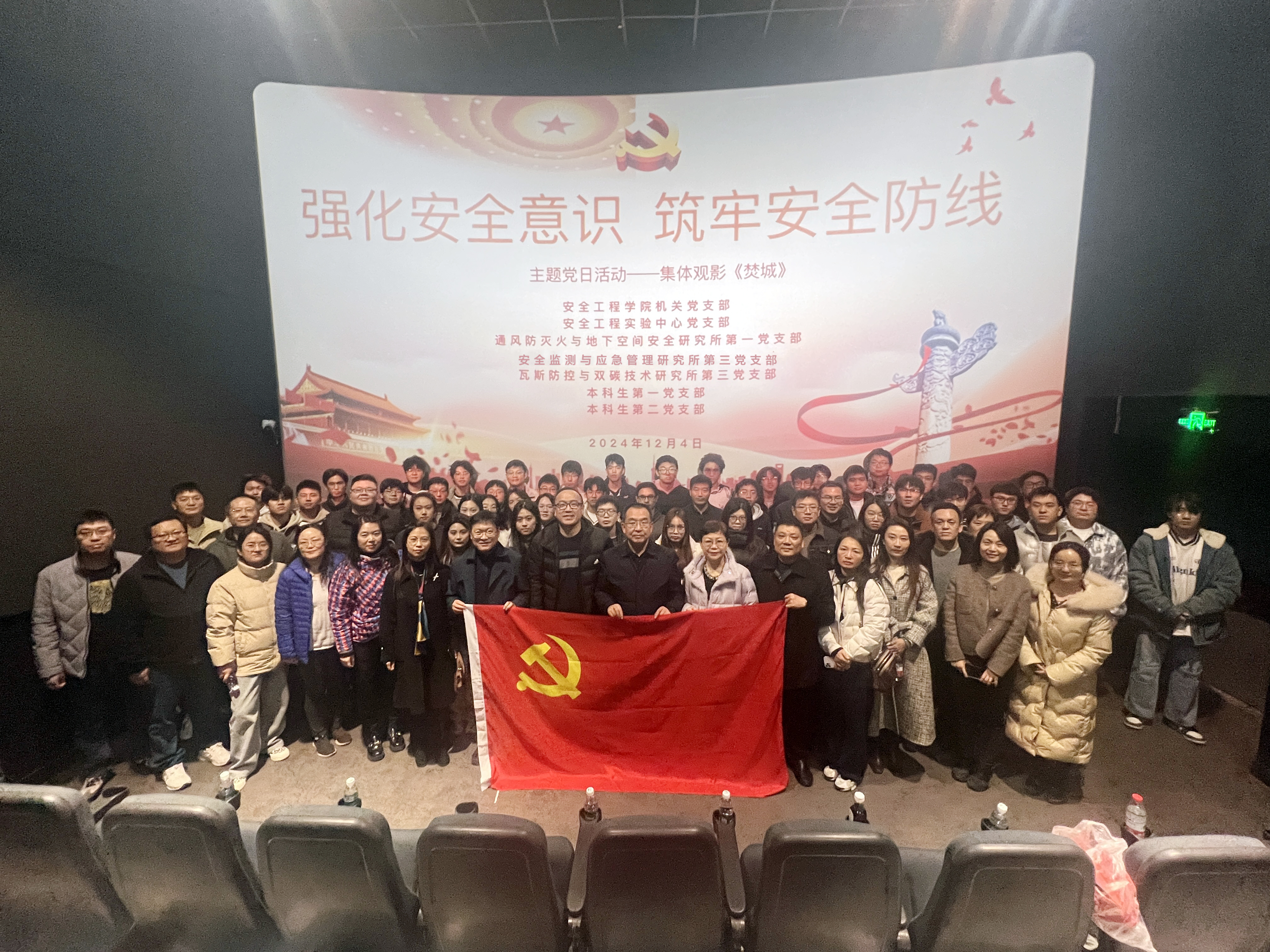 机关党支部联合实验中心党支部、通风防灭火与地下空间安全研究所第一党支部、瓦斯防控与双碳技术研究所第三党支部、瓦斯防控与双碳技术研究所第三党支部、本科生第一党支部以及本科生第二党支部开展“强化安全意识,筑牢安全防线 ”主题观影联合党日活动,集中观看了影片《焚城》。安全学院党委书记王恩元参加了活动。