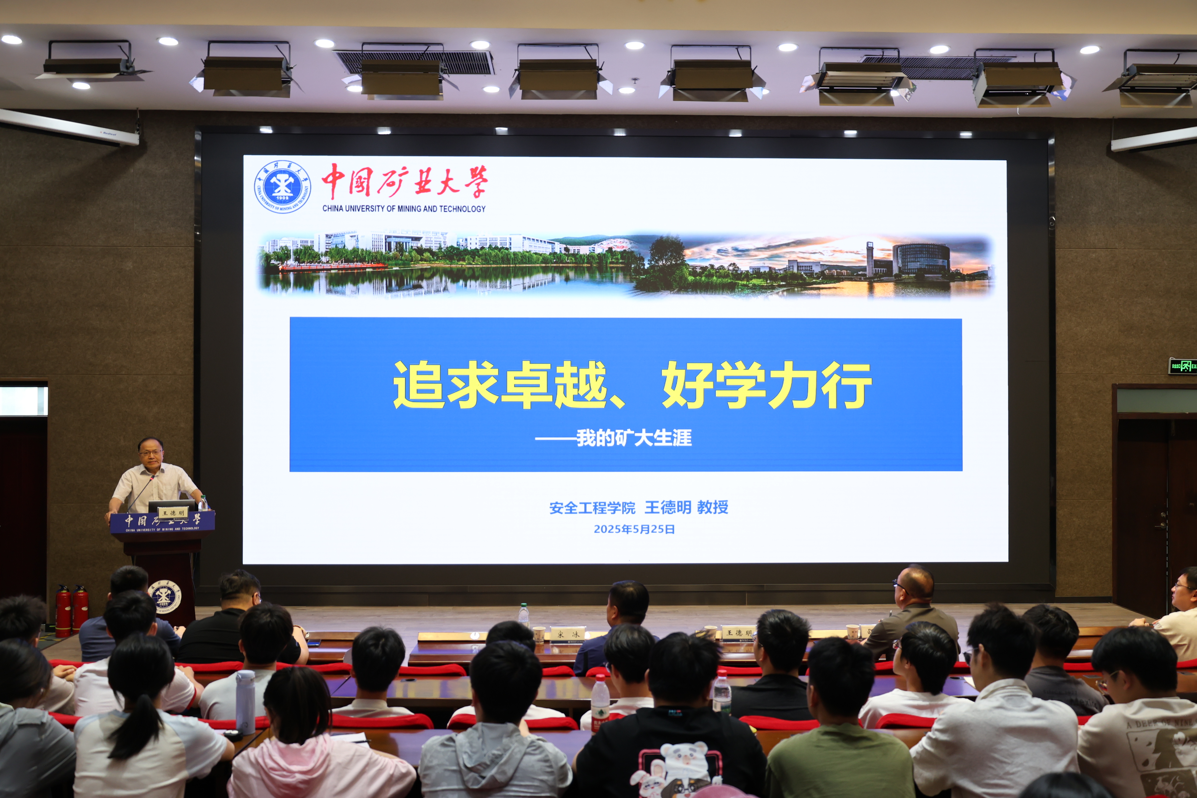 王德明教授结合自己林场知青生活、矿大求学时光、波兰留学经历、教育教学感悟等内容勉励青年学生无论身处什么样的环境都要坚定理想信念,不能放弃对未来的追求、对知识的渴求,在学习过程中要勤于思考,持之以恒,善于发现和捕捉学科前沿问题,探寻问题的解决方法与路径。结合自己从事应急救援决策系统、煤自燃机理及防治技术、煤矿热动力灾害防治等科研工作的体会,王教授勉励同学们要秉承“追求卓越”的矿大精神,坚守“开发矿业、开采光明、奉献祖国、造福人类”的初心使命,弘扬一代代安全人矢志矿山重大灾害防控所展现的“扎根一线、攻坚克难、创新敬业”责任担当,以“迎难题、闯前沿、争一流”的勇气与毅力,厚德博学,创新笃行,茁壮成长为安全学科一流拔尖创新人才。