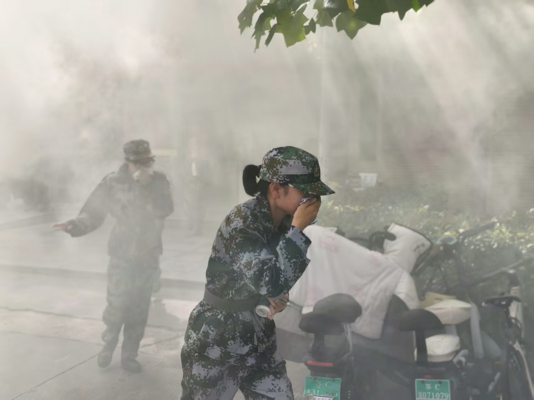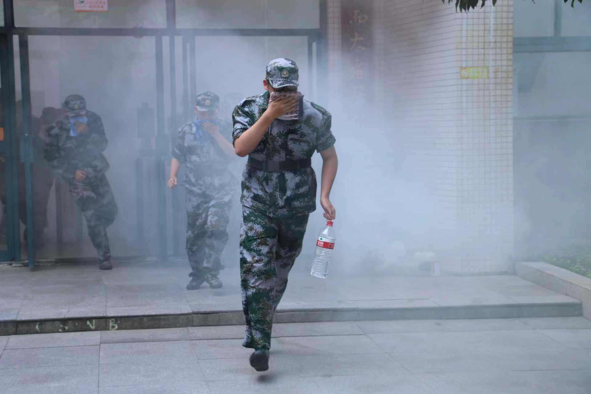 随着急促的警报声骤然响起,全体新生迅速进入紧急响应状态。在执勤教师和学生干部的有序引导下,参演学生严格遵循疏散要求,用湿毛巾掩捂口鼻,低姿弯腰,沿着指定安全通道快速、有序撤离宿舍区域。根据预案部署,海角社区