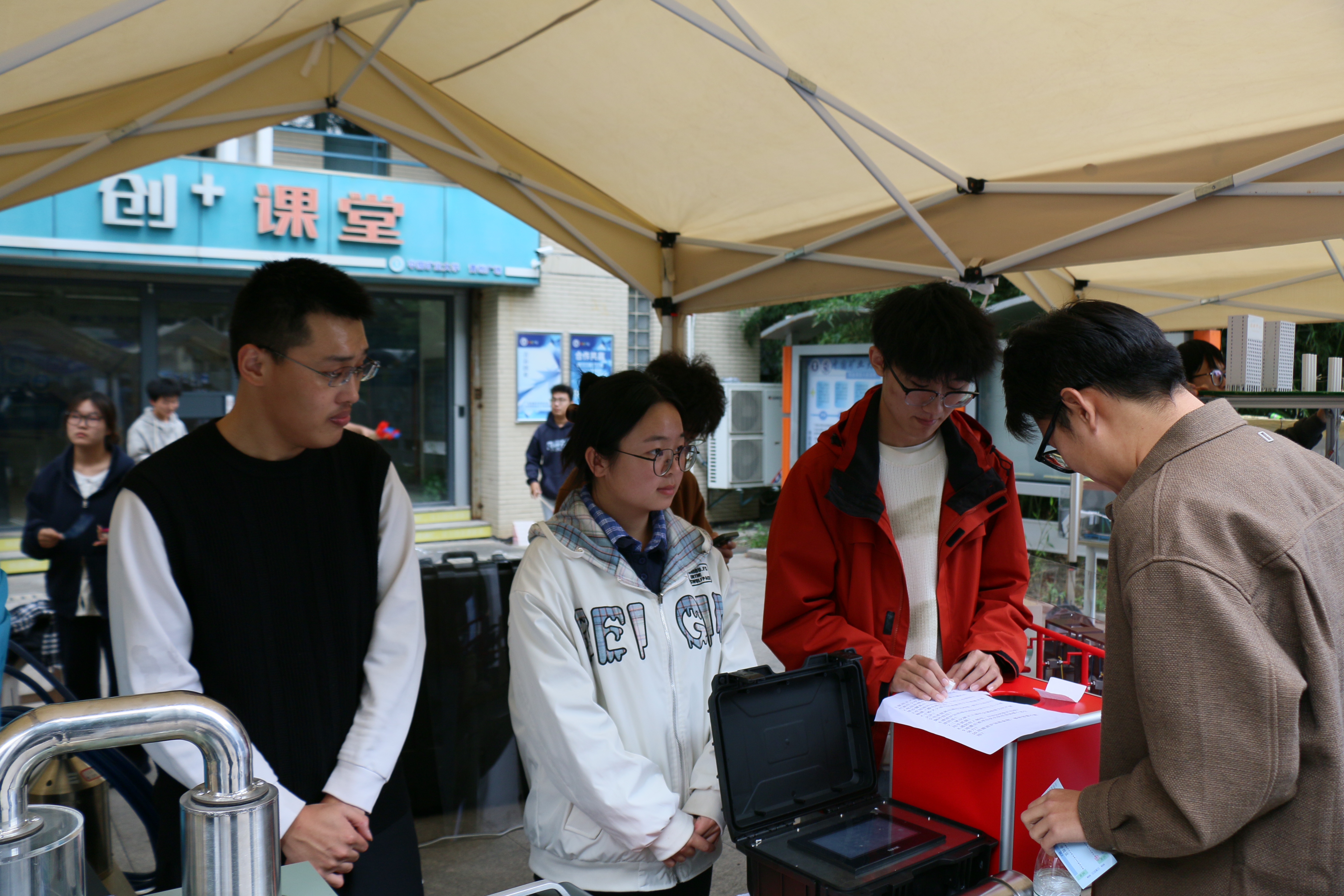 展区陈列了学生自主开发的小型监测设备与专业实验装置,项目团队成员为参观师生详细讲解了设备的功能原理与实际应用场景。展区旁设置的“安全工程学科育人体系”展板,系统呈现了学院的专业培养方向与教学成果。在“创+课堂”互动区,师生围绕科技项目的设计思路与实践价值展开交流,现场气氛活跃,展现了学院学子良好的创新意识与实践能力。