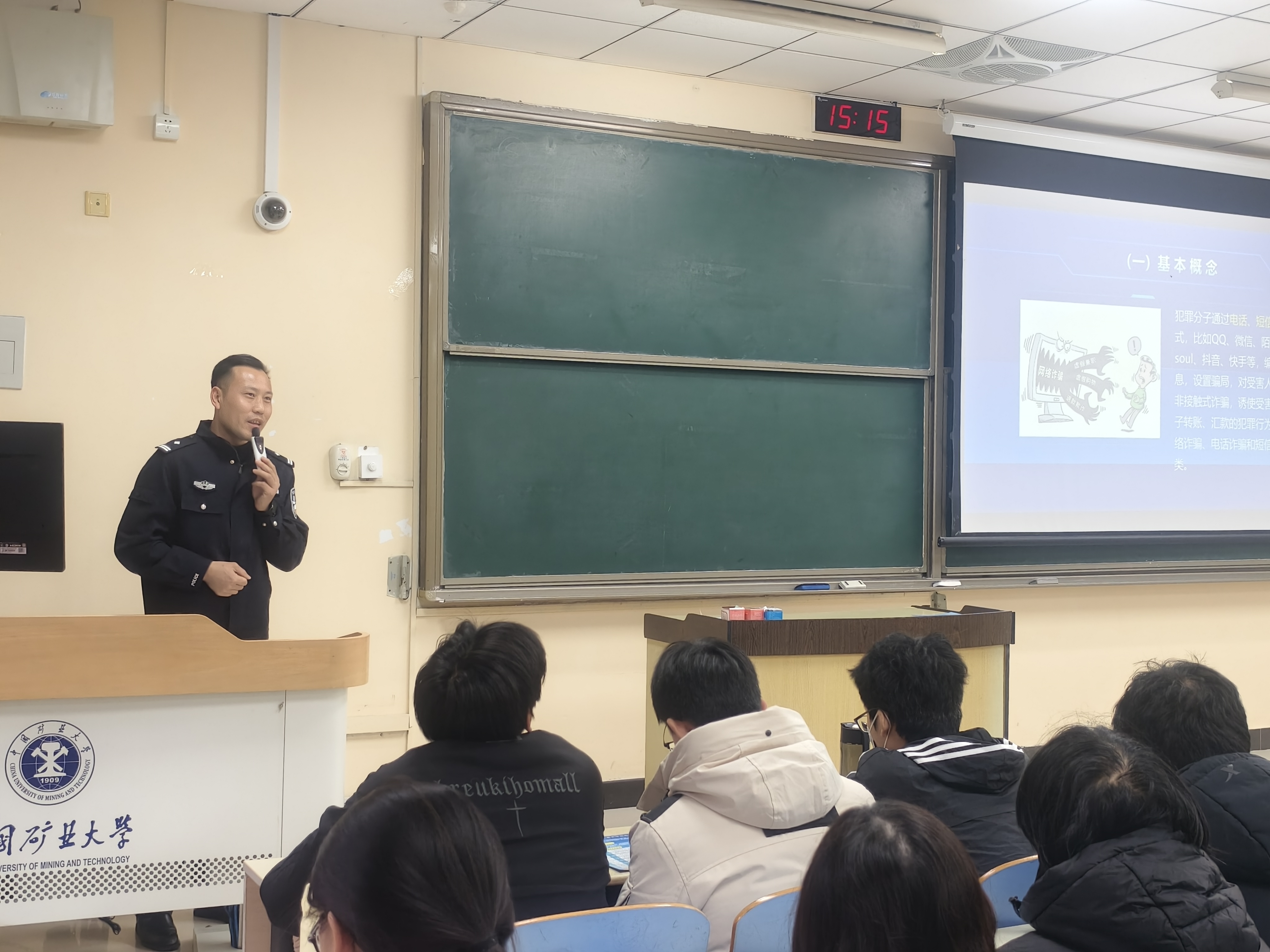 为切实增强学生防诈骗意识和自我保护能力,筑牢校园安全反诈防线,12月31日,学院特邀徐州市公安局刑侦支队民警刘磊于博四A103为2023级本科生开展反诈科普讲座。