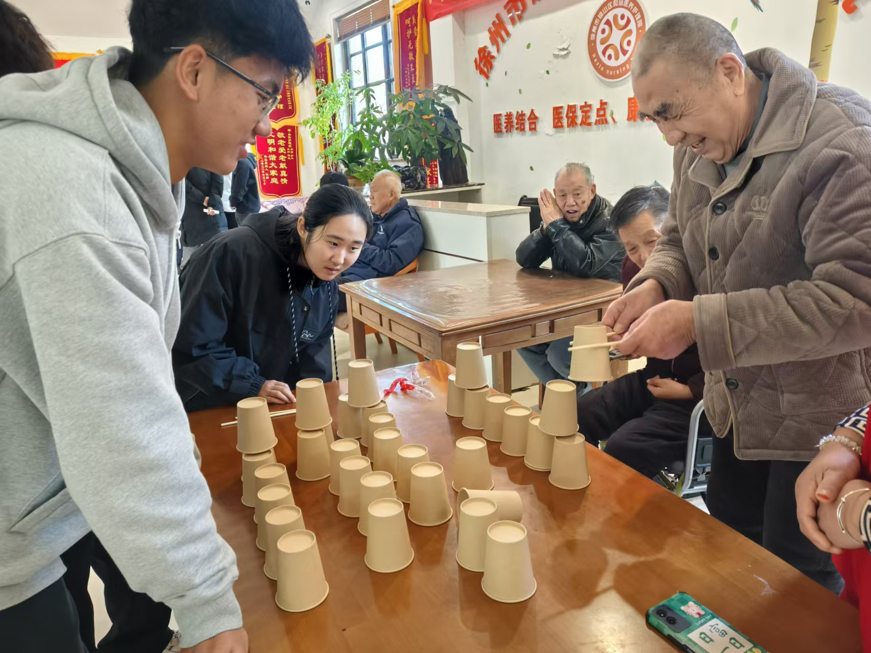 活动伊始,同学们进行了简短的自我介绍,他们真诚的话语、亲切的笑容拉近了与老人们之间的距离,让原本安静的氛围变得活跃起来。同学们首先为老人们献上了一场合唱表演,从经典的老歌到欢快的民歌,老人们沉浸其中,用心感受着音乐的魅力。在温馨的歌声余韵中,同学们与老人们围坐在一起,听老人们分享着他们亲身经历的历史故事,同学们专注地聆听,在交流中,两代人的心灵更加贴近。最后,在确保安全的前提下,同学们带领老人们进行叠杯子等游戏,同学们耐心地向老人们讲解游戏的技巧和规则,老人们也凭此锻炼了动手能力和思维反应能力,老人们也纷爱与温暖在彼此间流淌。