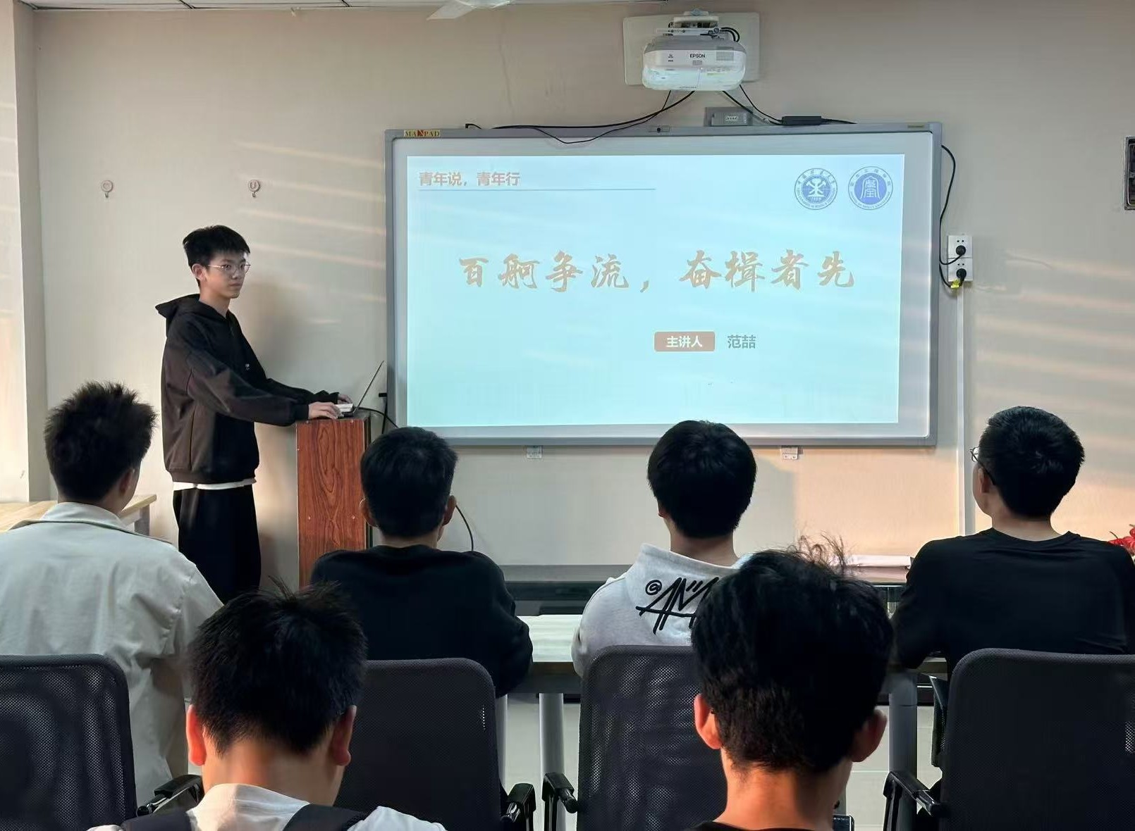 学生党员工作站于行健书院力行轩开展“百舸争流,奋楫者先”主题讲座。朋辈导师范喆受邀主讲,2024级9班全体同学参加本次活动。