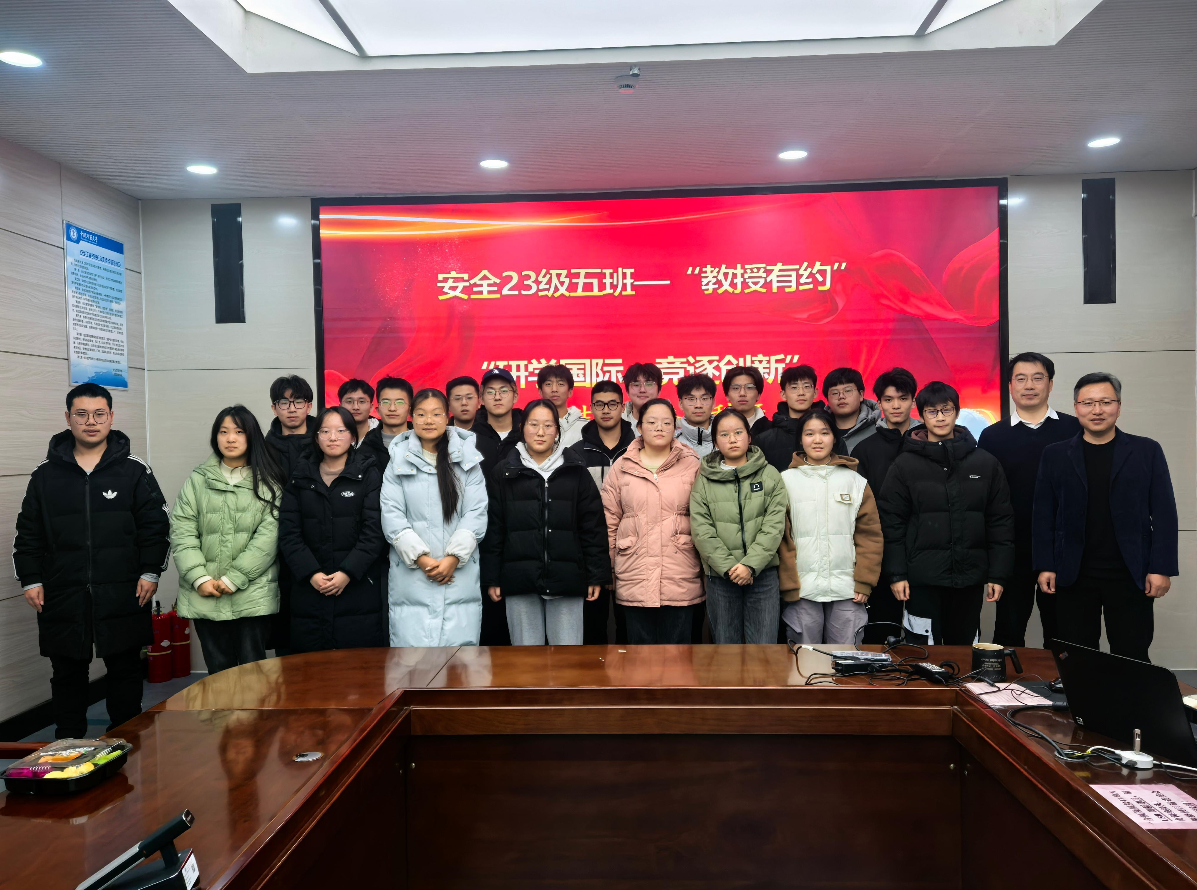 为帮助同学们做好大学生涯规划,了解学院人才培养计划和科研工作,1月7日晚上,安全23-5班于矿科A412开展“教授有约”活动。时国庆教授受邀担任主讲,行政班主任唐俊老师主持本次活动。2023级5班全体同学参加本次活动。
