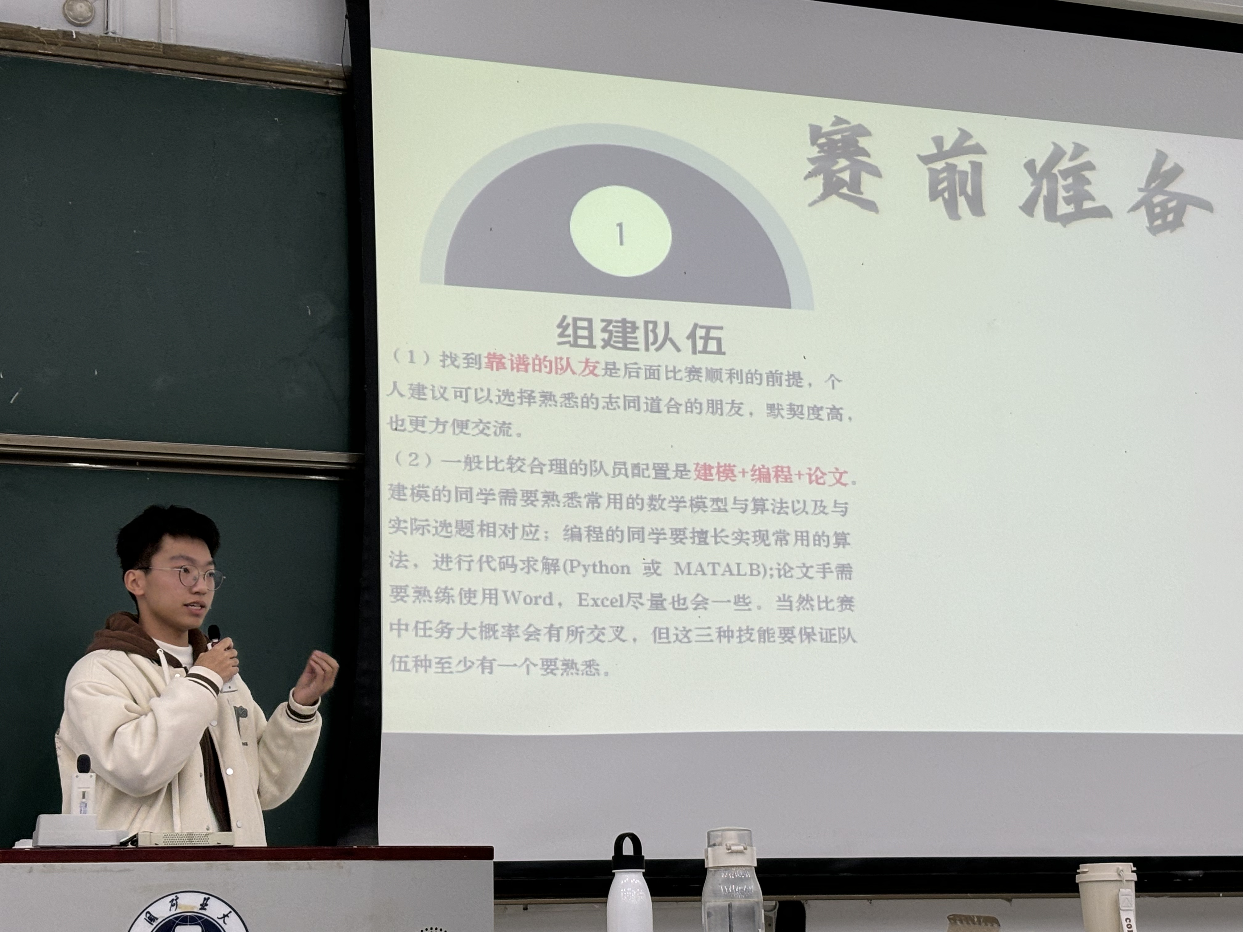 的俞嘉濠同学、经济管理学院的贾聪聪同学、数学学院的吴斌同学分享他们有关科技创新的经验。俞嘉濠同学着重向我们介绍了《全国高校安全科学与工程大学生实践与创新项目作品大赛》的相关注意事项,从竞赛基本信息,到备赛注意事项,再到个人心得体会,向我们介绍了大体的参赛流程。吴斌同学则聚焦于数学建模,着重强调了论文框架、建模与编程,并分享了一些他对于数学建模比赛的建议。贾聪聪同学以“未选择的路——脚下之路”为主题,分享了关于参加竞赛与加强相关经验之间的关系,并向我们介绍了关于简历的相关内容。