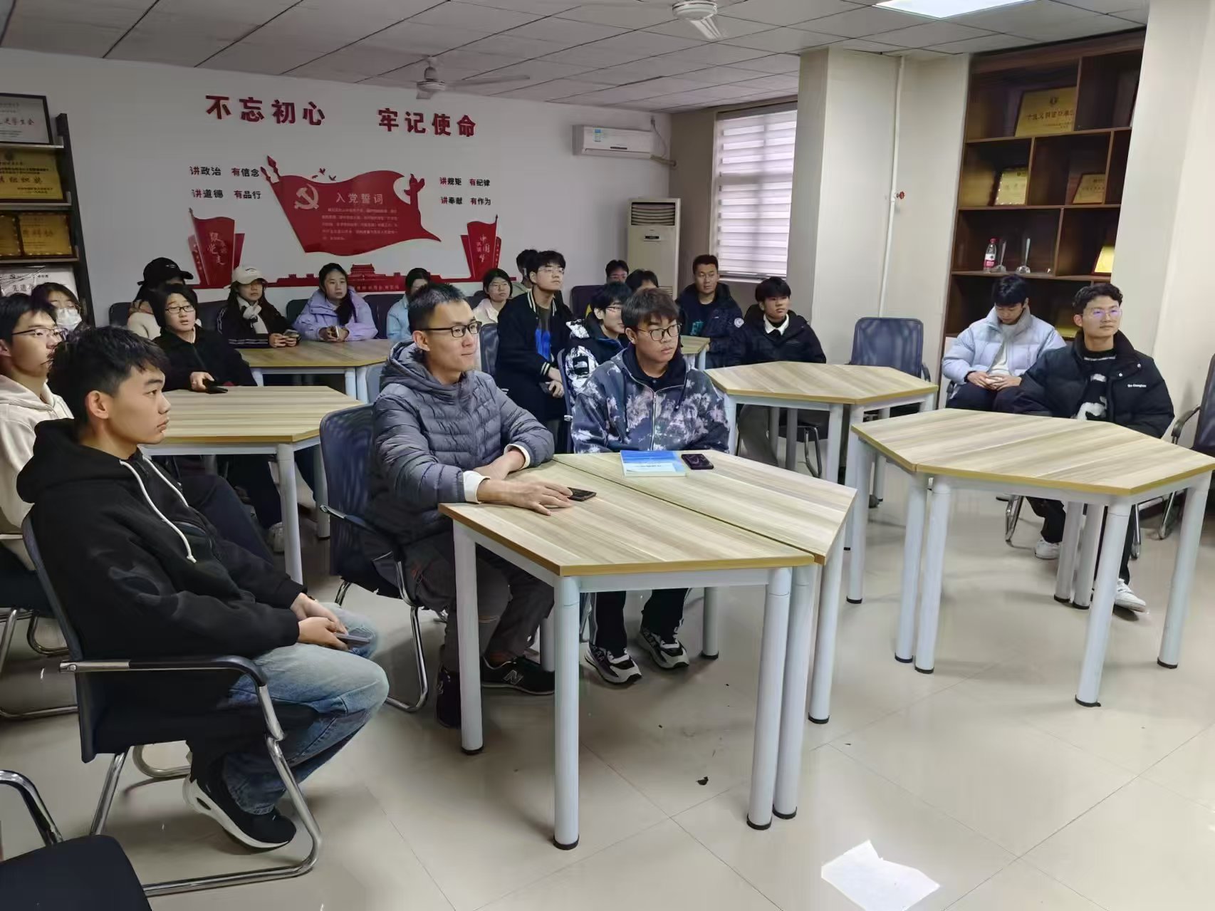 于梅三五楼力行轩开展“凝心聚力,逐梦未来” 主题讲座,董浩然同学受邀主讲,消防工程2023级1班同学积极参与。