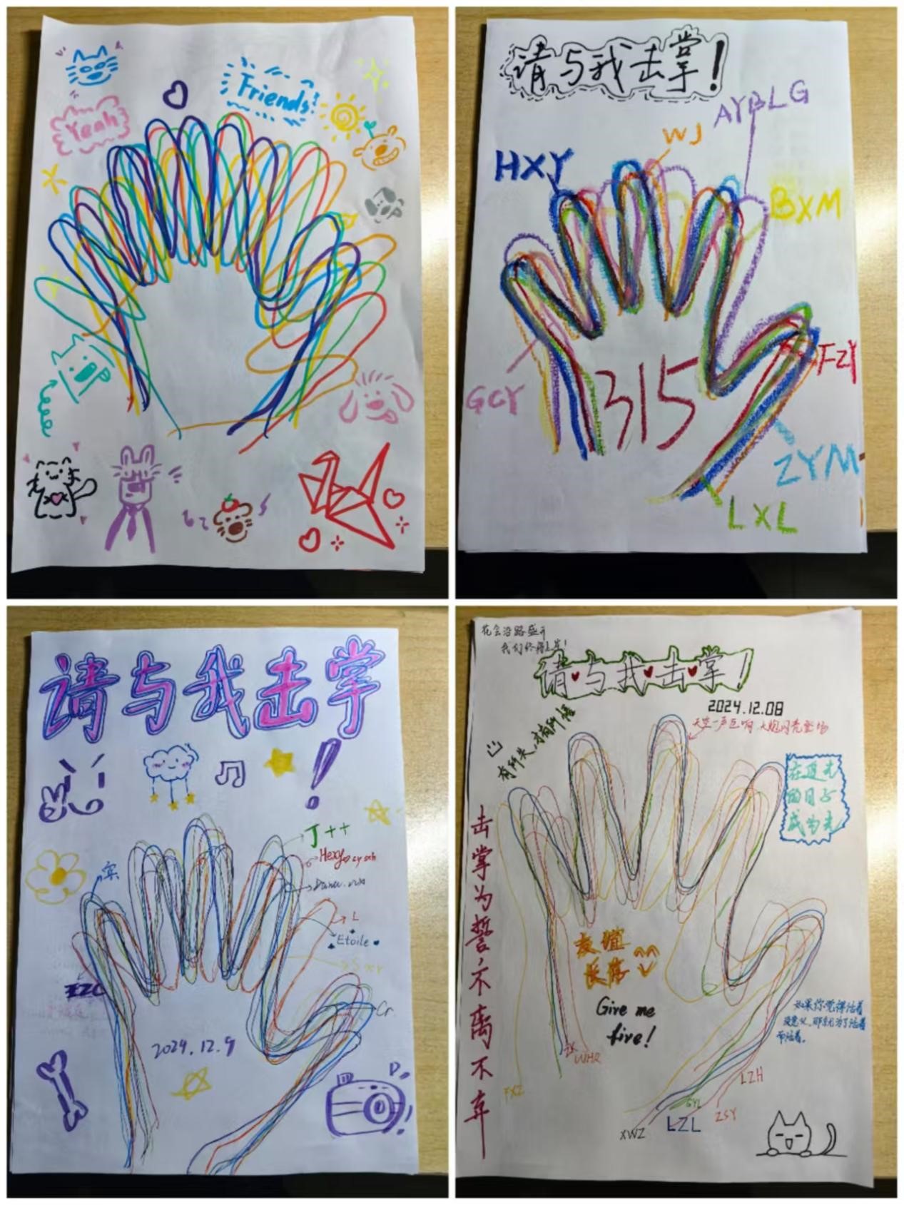活动前期,主办方通过宣传海报和学院官方QQ平台广泛宣传活动,成功吸引了学生的广泛关注。活动期间共有超过50名学生积极报名参与。参加活动的学生们以8至16人为一组,自备A4纸张和彩色笔,在纸上描绘出自己的手掌轮廓,并留下姓名或昵称以及个人寄语。每个小组选举了一名组长,负责组织协调工作。活动结束后,评审团队依据既定标准对作品进行了评选。