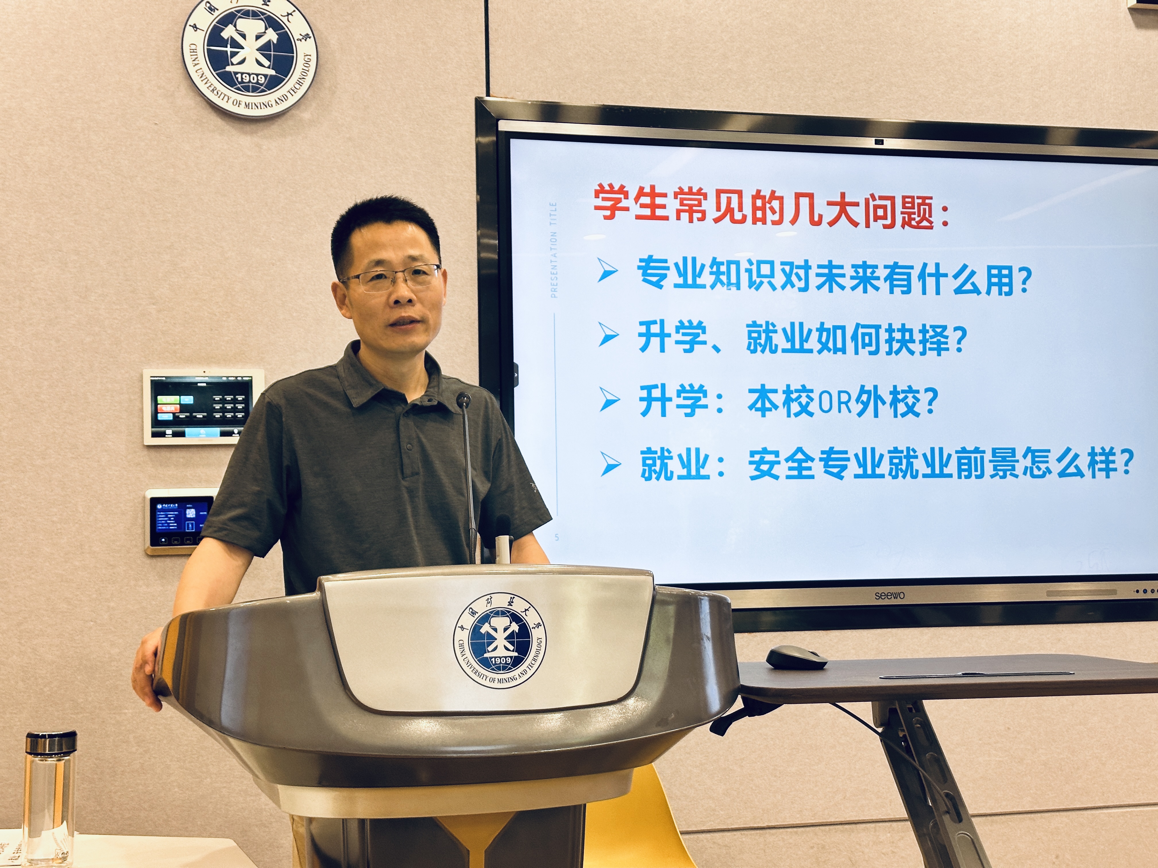 于博5A201开展以“大学生职业发展规划”主题教授有约活动。翟成院长受邀主讲,辅导员赵厚宽,行政班主任余旭、优秀学生代表魏则宁及矿山安全2022级1班全体师生参与其中。