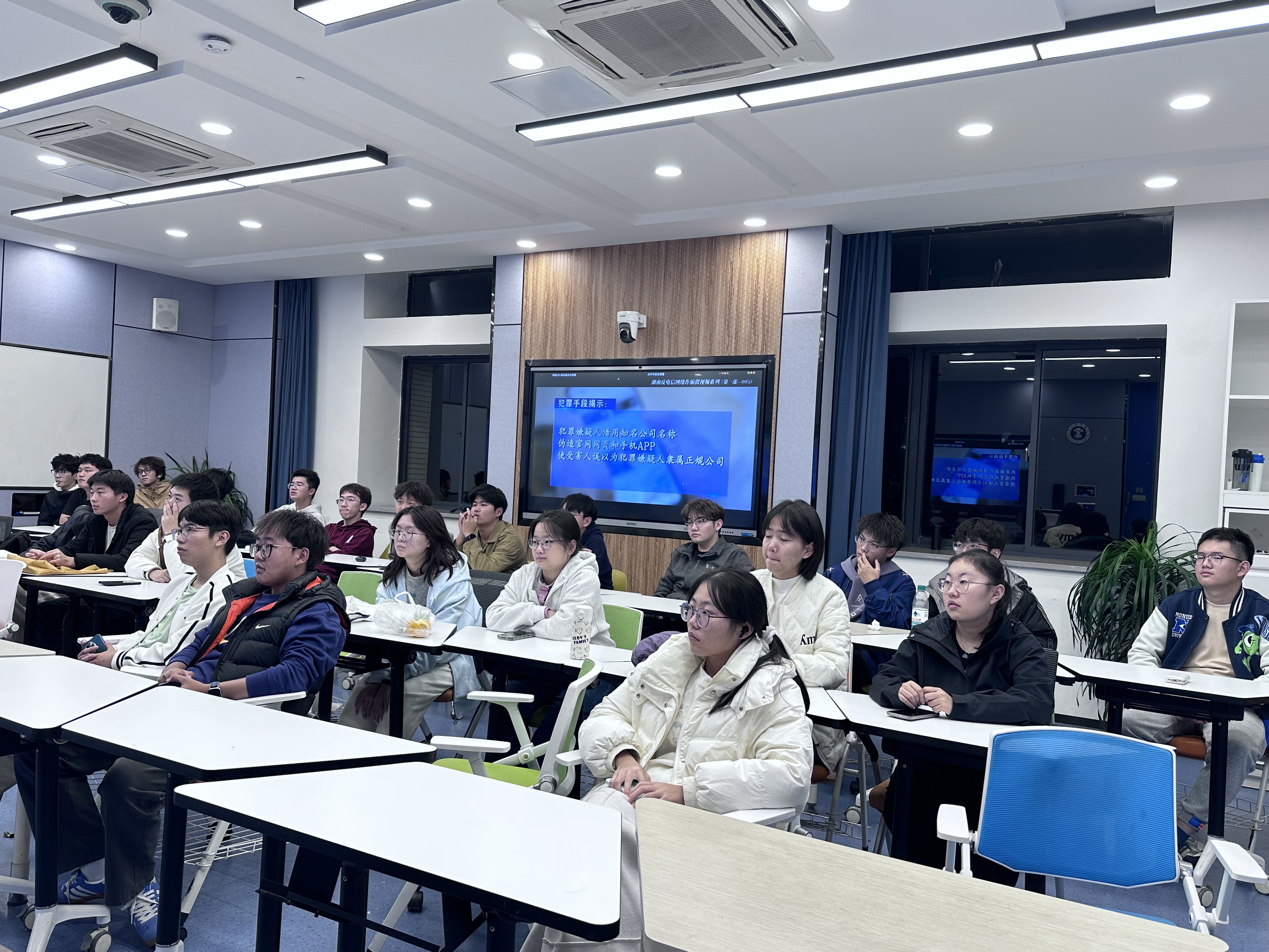 各年级同学分别在指定场地集中观看防诈警示教育视频。视频结合网游充值诈骗、刷单返利、虚假购物、短信钓鱼等高校频发案例,深入解析诈骗手法与防范要点,引导学生增强识别能力,强化个人信息保护意识,筑牢思想防线。在交流环节,各会场学生代表结合视频内容进行重点提示,提醒大家牢记“不听、不信、不转账”原则,遇到可疑情况及时与辅导员或学校相关部门沟通,从源头阻断诈骗风险,切实保障人身与财产安全。