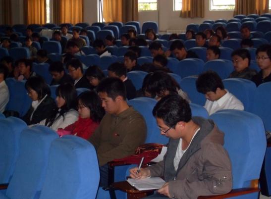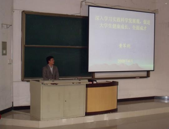 全体学生党员在教二C102参加了学习科学发展观主题报告。本次报告会由外文学院党委副书记黄军利老师主讲,海角社区