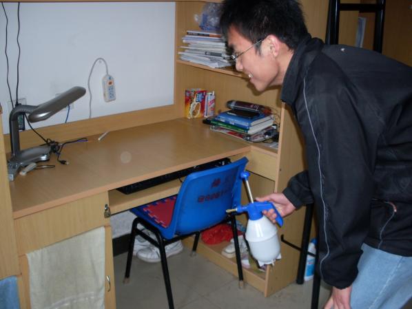 学生会生活部成员对学生宿舍进行了一次全方位的消毒。