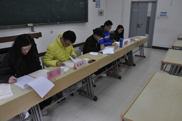 比赛开始之前,主持人简单介绍了比赛规则,流程以及出席本次决赛的嘉宾。上午九点,书法比赛正式开始。书法比赛分为硬笔书、软笔两种形式进行。氤氲的墨香中,选手们纷纷提笔、着墨。据悉,本次比赛硬笔组与软笔组的书写内容由同学们自行选择,既有靓丽的诗篇,又有古代贤人的名言警句,还有富有极深刻的人生哲理及价值内涵的文章。选手们的作品字体极为丰富,有刚正不阿的楷书,有古色古香的隶书,更有潇洒飘逸的行书。在宁静却又紧张的氛围中,选手们聚精会神、胸有成竹,有的挥毫泼墨、飘逸洒脱,有的一笔一划、认真专注,有的气韵横生、一气呵成,一幅幅颇具神韵的作品展现了同学们对中华古老文化的向往。比赛结束后,由各学院传媒中心主任以及书法协会的评委为同学们的作品打分评奖。