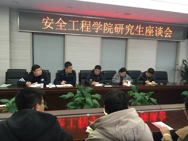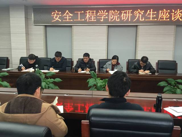 于矿科A412举办了研究生座谈会,党委副书记钱雄作为本次座谈会主讲,学工办主任于基伯,科研办主任程婷婷,辅导员刘世通、吕明哲以及安全学院优秀研究生代表参与本次座谈会。