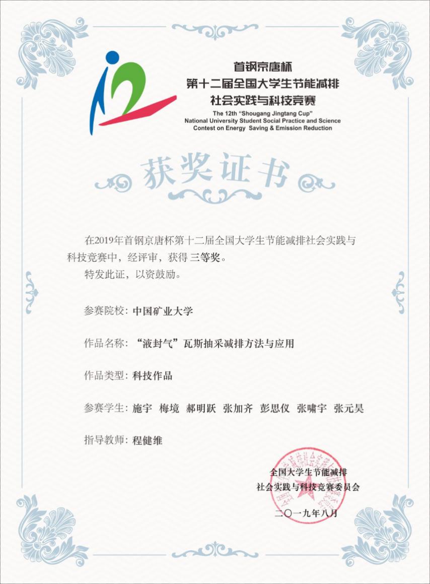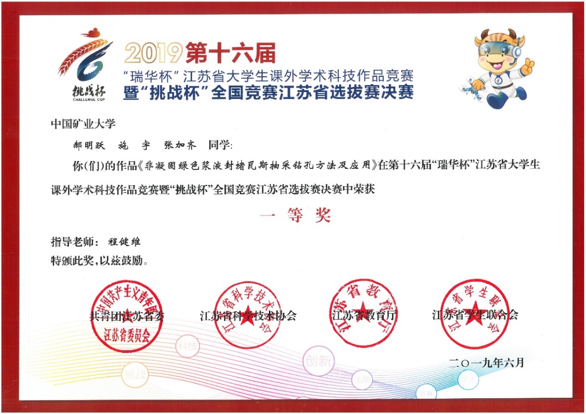 学习期间,他为了提高自己专业知识应用实践能力,积极参与多项大学生创新创业实践竞赛,在竞赛中一次次锻炼自己的综合能力。在他与指导老师的共同努力下,荣获2019年第五届全国高校安全科学与工程大学生实践与创新作品大赛国赛一等奖,2019年第十六届“挑战杯”全国大学生课外学术科技作品竞赛国赛二等奖、省赛一等奖,2019年第十二届大学生节能减排社会实践与科技竞赛国赛三等奖,2019年第五届中国“互联网+”大学生创新创业大赛江苏省赛二、三等奖各一项,2019年第五届全国大学生能源经济学术创意大赛国赛三等奖,2019年第三届海角社区