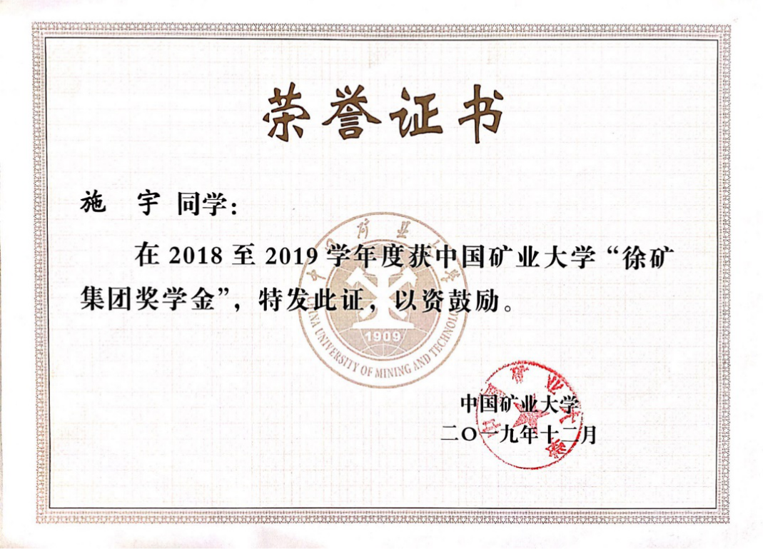 主要荣誉:两次荣获国家奖学金,徐矿企业奖学金和孙越崎优秀学生奖,全国煤炭行业优秀共青团员和江苏省省级三好学生,2019年第五届安全科学实践与创新作品大赛国赛一等奖,2019年第十六届“挑战杯”全国大学生课外学术科技作品竞赛国赛二等奖,2019年第十二届大学生节能减排社会实践与科技竞赛国赛三等奖等,连续三年获评校级优秀学生干部和校级优秀共青团干