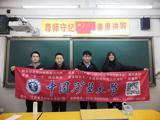 为展示矿大精神,发扬矿大学风,助力母校高考,2019年1月30日上午,矿大赴陕西省咸阳市“优秀学子母校行”实践团来到了省级规范化学校——咸阳渭城中学展开了宣讲活动。本次宣讲活动,旨在向学弟学妹们介绍矿大,并分享高三的学习经验,助力高考。渭城中学作为咸阳市第一所省级规范化学校培育了一批又一批优秀的学子,渭城中学在矿大的队伍也逐渐的壮大起来。
