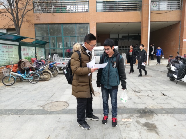 中午12时,志愿者们准时来到三食堂门口开始宣传。据悉,本次活动将以笔尖传情的方式,让同学们发挥文采创作关于宿管阿姨、食堂阿姨、保卫处大叔的赞歌,传递他们对这些一直默默为我们奉献的人的脉脉温情。在一番介绍后,很多同学对本次活动表现出很高的热情,表示愿意参加本次活动。志愿者们建议那些对本次活动有兴趣的同学们扫码加群进一步了解活动相关信息,鼓励他们积极参加本次活动。尽管正值中午吃饭的时间,但志愿者们毫不在意。他们忍受着饥饿,在寒风中拿着传单,一遍又一遍耐心地向路过的同学宣传活动的内容,以求更多人可以了解并参加到这个活动中来。从人来人往的高峰期一直到所有人吃完离去,志愿者们一直面带微笑,尽职尽责。