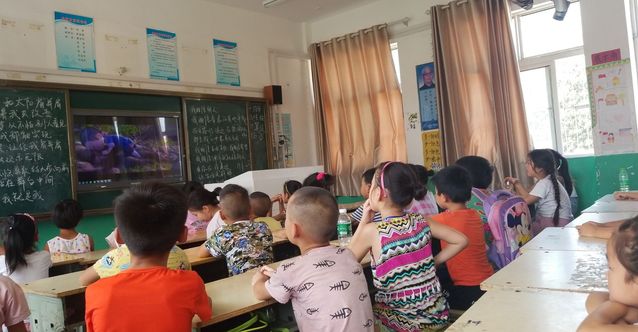 “仲夏希望”支教团带领陶楼小学的学生们观看国产动漫电影《大圣归来》。