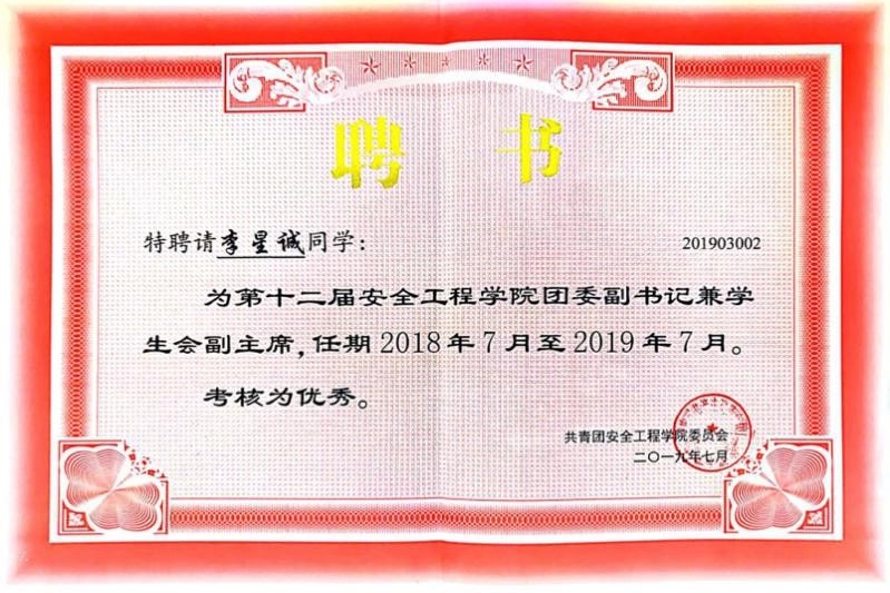 曾任安全学院第12届(2018-2019学年)团委副书记兼学生会副主席,分管创新创业中心及学业发展中心,负责协助学院开展学风建设与创新创业、科技学术等方面的学生工作,考核为优秀。