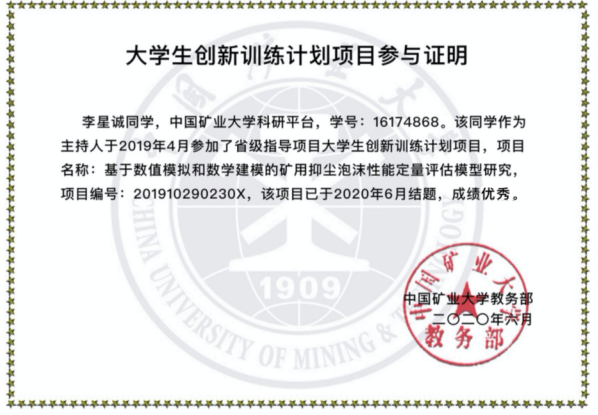 依托安全学科双一流建设平台,先后参与及主持各类创新训练项目共5项,其中国家级2项、省级项目(考核为优秀)1项,个人主要从事《泡沫活性剂水基泡沫排液规律与性能评价模型》、《连续气相色谱法浓缩低浓度瓦斯》、《基于指标气体浓缩的煤自燃提前预报》等方面的研究,并已取得相当成果。参加第五届全国高校安全科学与工程大学生实践与创新作品大赛,取得全国三等奖。