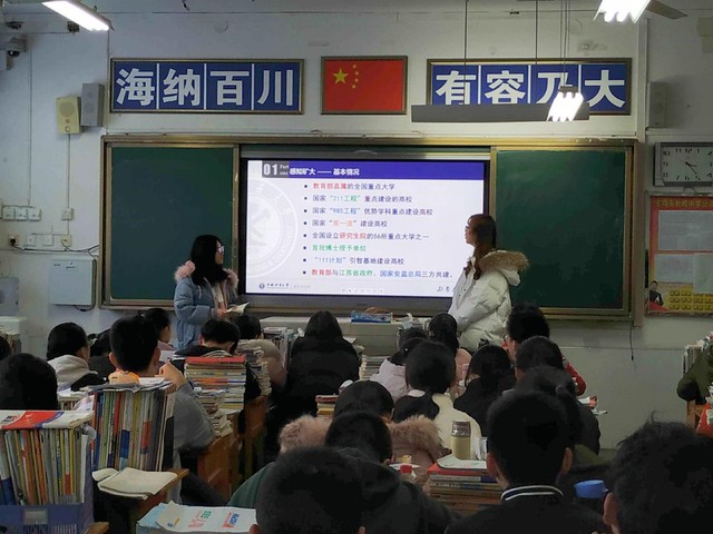 小组成员首先去拜访了高中老师,和老师讲述了大学生活的体会,并感谢老师曾经不辞劳苦的栽培。小组成员进入班级后,通过PPT向同学们细致地介绍了矿大的学术资源、奖助政策、校园生活、录取分数等方面的信息,同时与学弟学妹们分享了自己极具吸引力的大学生活,并向他们赠送了矿大的明信片。在自由提问环节,同学们关于学习方法、心态调整、高考志愿、矿大详细情况等进行了踊跃地提问,小组成员对同学们提出的问题做出了详细的解答,并以矿大“好学力行”的校园精神鼓励学弟学妹们积极备考、勇于追梦。最后,小组成员还留下联系方式,以便日后继续为学弟学妹们答疑解惑。
