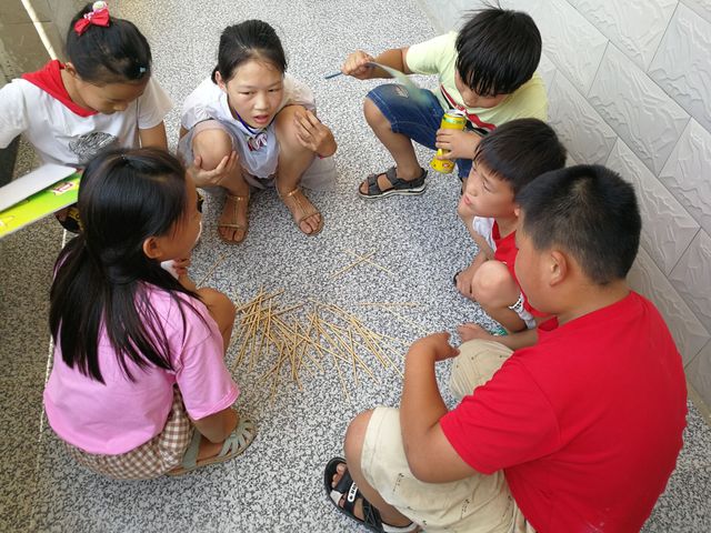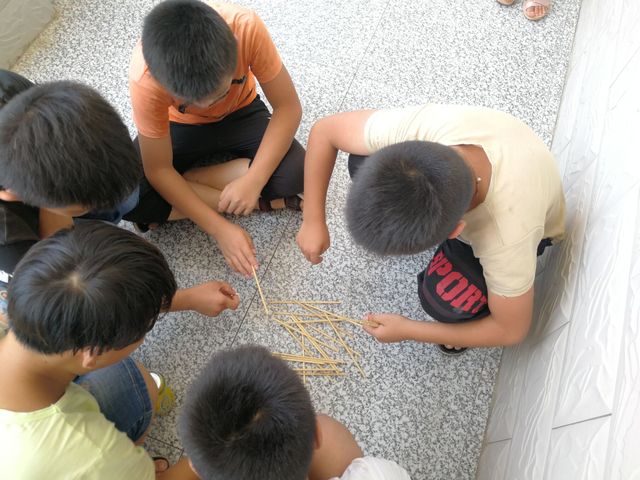 上午10时,负责五年级的支教团成员把同学们带领到教室外的走廊,并把班级同学分成三组,同时进行游戏。活动负责人李木剑老师向同学们介绍了游戏规则和需要注意的事项,并且再三强调了游戏期间的安全问题。游戏正式开始,支教团成员拿出数十根筷子,让学生们围成一个圈,由李老师示范一遍游戏操作。同学们学会后依次参与了这个游戏。在游戏之初,老师发现孩子们玩得并不不耐心,操作很生硬,完成度也不高。针对这些问题,老师手把手教孩子们如何巧妙地挑起筷子,而不碰到其他筷子。在老师的帮助下,许多孩子逐渐掌握了游戏技巧,参与游戏也越来越积极了。游戏结束后,杨振宇小朋友对老师说:“这个游戏刚开始挺难的,但是我后来就学会了怎么观察了,我刚刚连着挑起5个呢!”
