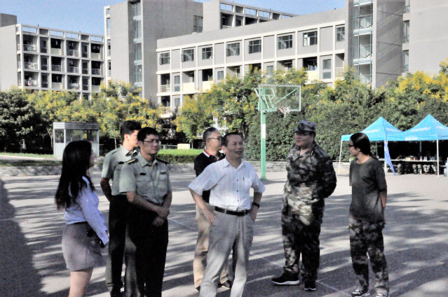 为了解新生军训情况,进一步落实好军训期间各项工作计划。9月7日下午,安全学院党委书记章毛平、党委副书记钱雄、行政副院长朱晓东在辅导员刘世通等人陪同下前往第三运动场视察2018级新生军训情况。