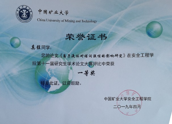 第十一届学术论文大赛一等奖;2018年亚太地区数学建模大赛三等奖;首届全国高等学校安全科学与工程类专业大学生实践与创新作品大赛二等奖;2014-2015国家励志奖学金;2014-2015专业学习类奖学金;2015-2016社会公益类奖学金;2015-2016校级优秀学生。