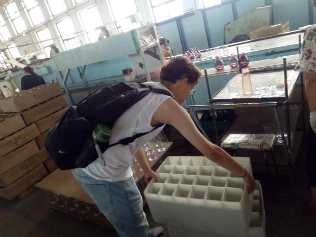 上午八点半,成员们集合完毕,来到玻璃文化产业园生产车间继续实践玻璃成品包装过程。在工人师傅的指导下,成员们在等玻璃制品退火冷却并进行了打磨修饰后,将成品依次分类按序整齐放入箱子的小格子中。为避免搬运过程中对玻璃造成破损,同学们需要在包装过程中对玻璃进行固体和软保护措施,确保运输安全。另外包装的同时也要对玻璃进行筛选,不合格的玻璃要及时挑选出来重新处理。