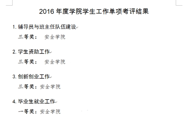 近期学校公布了对21个学院(部)2016年学生工作单项考评的结果,安全学院在7项学生工作单项评估中共获得一等奖1项、三等奖3项。学校学生工作单项评估每项一般设一等奖1个,二等奖2个,三等奖4个。孙留涛老师被评为“毕业生就业工作”先进个人,孙婷老师被评为“创新创业工作”先进个人,何伟民老师被评为“学生资助工作”先进个人。此次获奖是学校对安全学院2016年学生工作的肯定,是安全学院一大进步和近年来取得成果的一个重大突破。
