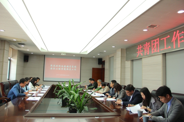 安全学院在矿业科学中心A412举行了共青团改革专项工作调研会。院党委书记章毛平、副书记钱雄、消防工程专业建设负责人朱国庆、团委书记孙婷、辅导员刘世通、陶冰冰及“挑战杯”备赛组成员参加了此次座谈会。