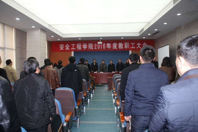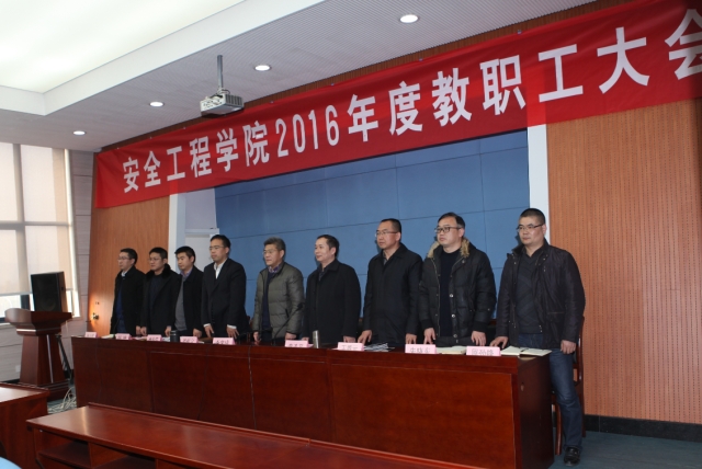会议在雄壮的国歌声中隆重开幕。李来成主席发表了热情洋溢的致辞,对安全学院2016年度教职工大会的召开表示祝贺,对学院2016年以来在人才培养、学科建设、科研工作、师资队伍建设、党群工作等方面取得的优异成绩表示祝贺。他说,安全学院在新年伊始例行召年度教职工大会,是学院依法治院、民主办学中的一件大事,是教职工民主生活中的一件大事,体现了学院领导的良好民主工作作风,是学院发展成熟的重要标志。他希望学院的年度教职工大会,作为民主办学、民主管理的一种重要形式,要切实落实教职工大会的各项职权,切实保障教职工的合法权利;院工会应主动作为,发挥好在学院民主办学中的作用;广大教职工要真正履行工会会员的职责,发挥主人翁的作用,充分利用教职工大会的民主管理渠道,为学院的发展建言献策。