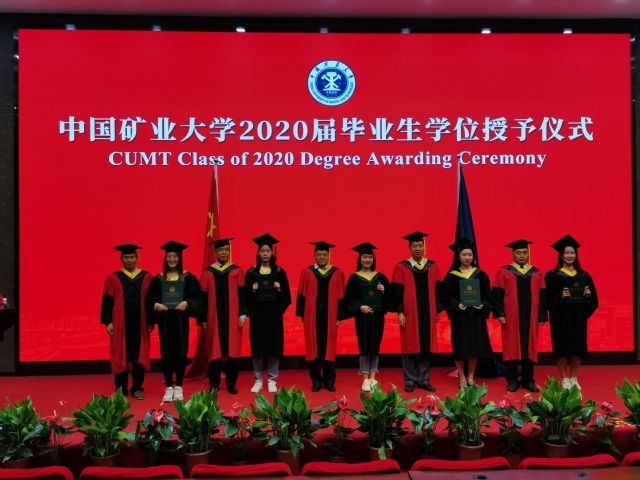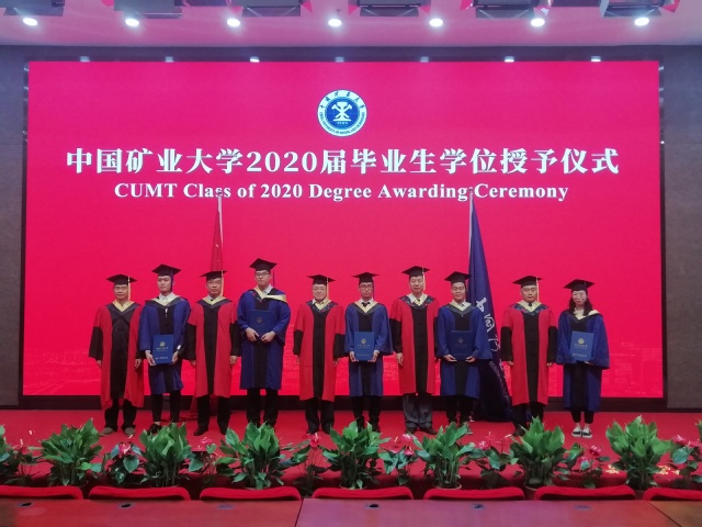 在图书馆报告厅举行2020届毕业生学位授予仪式。煤矿瓦斯与火灾防治教育部重点实验室主任王德明、院长王恩元、院学位评定分委会主任林柏泉、副院长秦波涛、消防工程教学中心主任朱国庆共同为82名海角社区