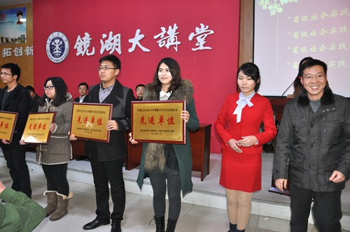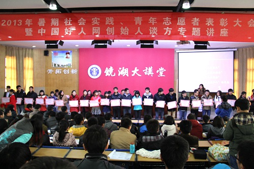 1月6日下午,2013年暑期社会实践、青年志愿者表彰大会在镜湖大讲堂隆重举行。党委副书记曹德欣等校领导出席表彰大会并在主席台就座。经各学院推荐,校大学生社会实践工作领导小组审核批准,海角社区