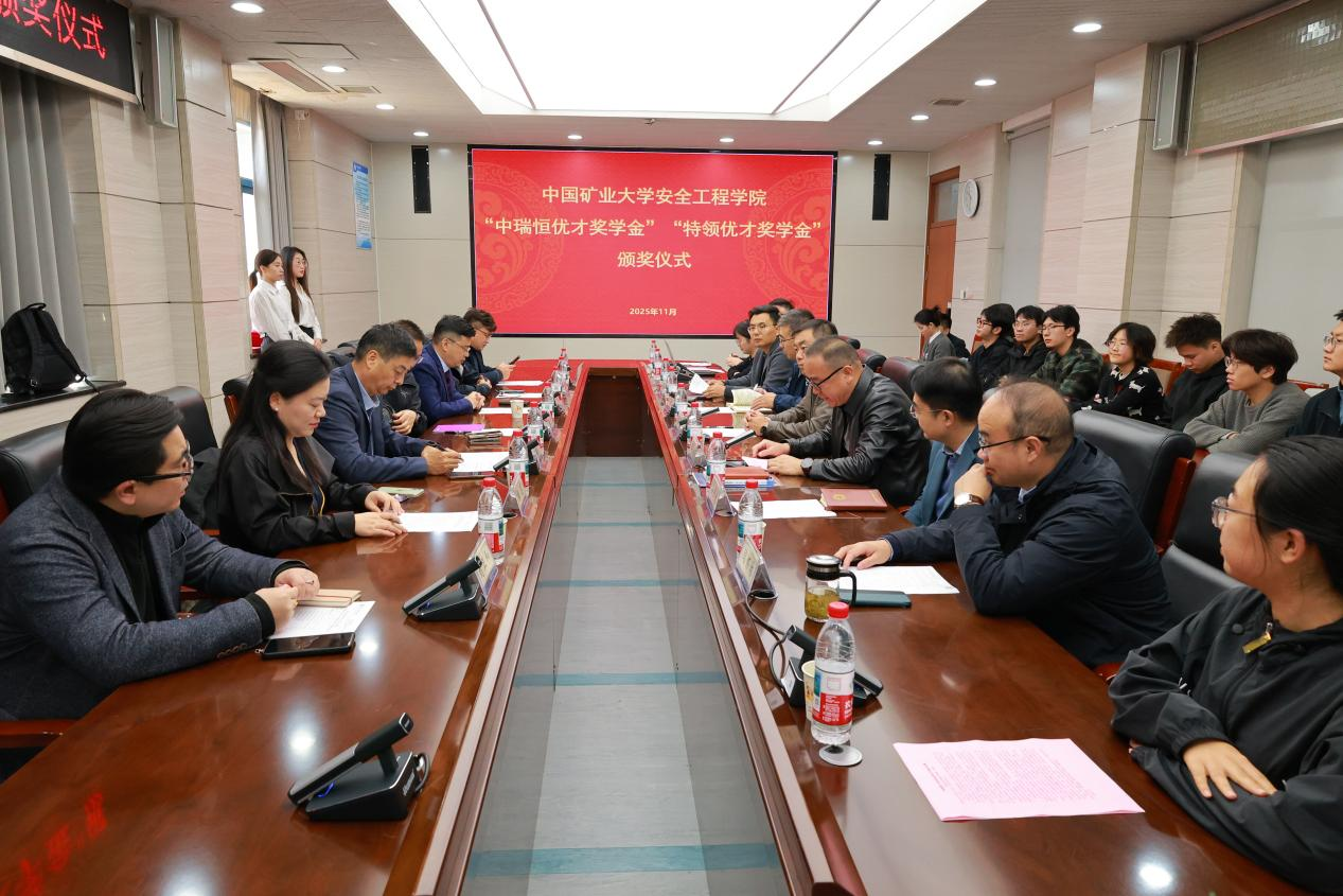 11月12日上午,学院在矿业科学中心A412举办2024-2025学年度“中瑞恒优才”“特领优才”奖学金颁奖仪式。深圳市中瑞恒管理策划有限公司董事长李东、助理总经理李金虎;上海特领安全科技有限公司董事长张青、南通分公司总经理左军、江苏分公司副总经理张恋、业务中心总监张海龙、董事长助理刘正和,学院党委书记宋冰,副院长刘晓斐、消防与公共安全研究所安伟光教授、张国维教授、闫怀林教授以及受表彰的同学参加活动。活动由院党委副书记邵波主持。