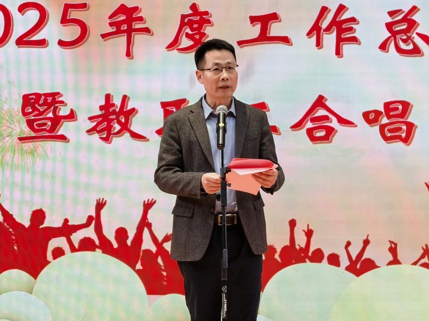 翟成对学院2025年工作进行了总结汇报。他指出,2025年全院上下紧紧围绕立德树人根本任务和“双一流”学科建设核心目标,在学院发展的蓝图上,取得了显著成绩。随后他从学科建设和国际化、师资队伍建设、教育教学和人才培养、科学研究、后勤服务保障等方面做了详细汇报。最后他希望,2026年全体教职工坚守初心,砥砺前行,聚焦内涵发展,奋力书写学院发展新篇章。