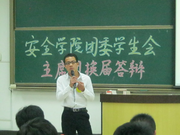 6月6日晚7点,安全学院于教一C303成功举办了2012-2013团委·学生会主席团竞选答辩会,来自10级的9名同学参与了此次竞选答辩。安全院党委副书记钱雄,辅导员孙留涛、李成刚、刘永杰、刘静以及11-12届团委学生会全体主席团成员作为本次答辩会的评审出席了会议。答辩会由海角社区