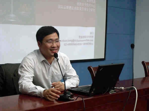 在讲座中,校友康力就目前担任的必维集团消防安全技术中心资深经理的相关工作,首先向大家介绍了奢华酒店高火灾风险、酒店行业发展迅速、中国房地产市场方兴未艾、境外酒店管理集团在中国蓬勃发展等酒店消防生命安全的行业背景。接着,他就奢华酒店消防及生命安全核心的相关技术要求,向同学们做了详细的介绍。在探测报警、自动灭火、防火分隔、应急电源、火灾响应及联动以及安全疏散等酒店消防的主要环节,康力校友利用大量的实物资料图片和图表数据,让同学们很快就对酒店消防的要点和现状有了生动直观的了解。