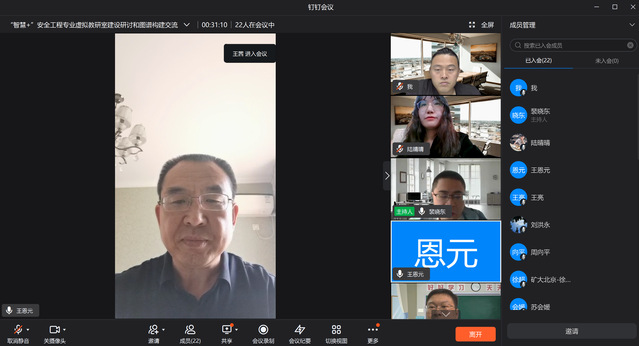 虚拟教研室执行负责人王恩元院长首先对与会各高校专家、老师表示欢迎,并介绍了本次教研交流会议是虚拟教研室启动后的第一次正式跨校、跨区域教研活动,会议主题“智慧+”教育信息化下安全工程专业虚拟教研室建设和学科知识图谱构建,探索在新教研理念下如何将“建资源”转变为“建体系”,将资源转化为知识,满足学生的个性化学习和教师的因材施教,探索创新教育学术研究之路。