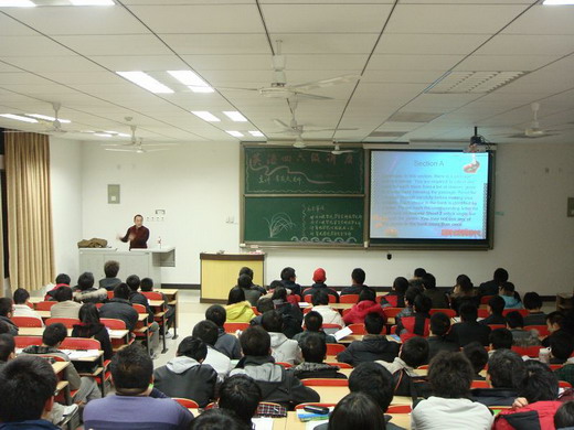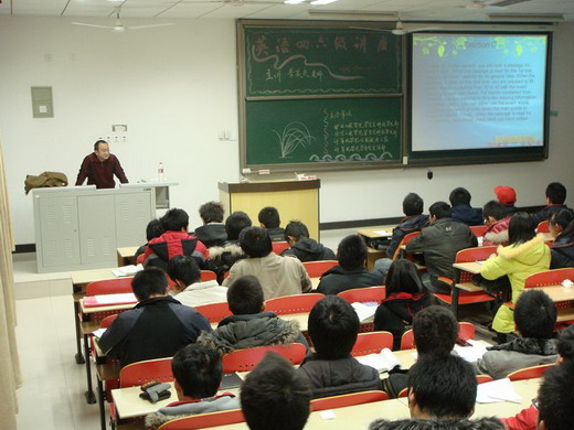 讲座还未开始,全场已经座无虚席,同学们都在急切地期盼李泉夫老师赶快到来。7:00讲座准时开始,李泉夫老师以其幽默风趣的方式开场,调动了全体同学的热情。在两个小时的演讲中李老师耐心地为同学们讲解四六级题型、应试技巧、及自己对今年考试的题目预测,细致入微的剖析引来同学们的不断掌声,诙谐有趣的讲解方式不时引来全场爆笑。同学们在愉悦的氛围中对四六级有了更深入的认识,同时学习到很多应试技巧和考试方法,尤其是对李老师独创的词汇爆破式记忆法感到由衷赞叹。