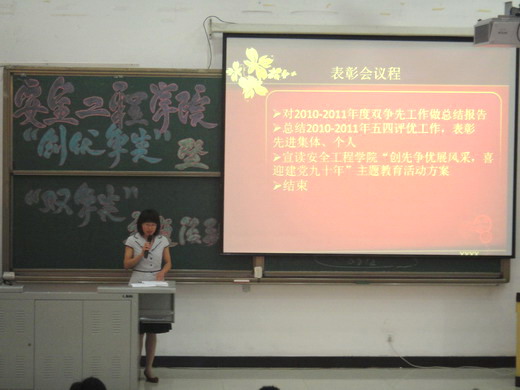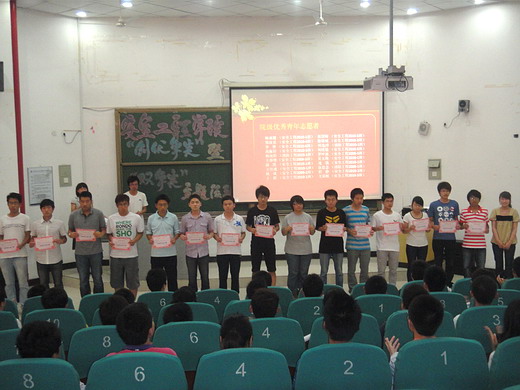 先进集体和先进个人的决定,同时对2010年涌现出来的校级和院级先进集体和先进个人进行了表彰。安全工程2009-4团支部和消防工程2010-1团支部被授予校“先进团支部”称号,安全工程2009-4团支部被授予校“团支部创新工作奖”称号,刘建安被授予校“五四青年标兵”称号,焦汉林和郭峰被授予校级“优秀学生会干部”称号,亓冠圣等21名同学被授予校级“优秀团员”称号,陈树亮等6名同学被授予校级“优秀团干”称号,安全工程2008-4班等3个团支部被授予“海角社区