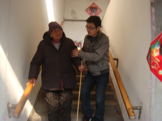 志愿者队伍在康汇托老中心院长的热烈欢迎后,分成若干个小组。有的志愿者们开始为老人们准备午饭,还有的志愿者把还在屋子里公公婆婆慢慢地搀扶到院子里,在温暖的阳光下同学们和老人们聊起了天。同学们都认真听公公、婆婆讲述改革开放前后的个人经历,令同学们了解到今天的幸福来之不易,同学们还了解到了一些老人们不同寻常的经历以及一些他们闻所未闻的历史事件,同学们也将自己在外面读书的情况以及各自家乡的建设和老人们进行了交流,院子里充满了欢声笑语。这拉近了双方之间的距离,并使得这次活动更加富有意义。通过相互交流老人们的内心得以安慰,而学生们的到来让他们感到自己不是孤独的,社会大家庭的温暖团团包围着他们。