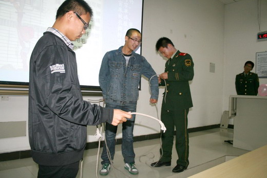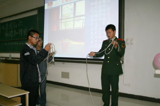 之后,苏磊队长根据自己工作中的实际案例向同学们一一列举了如何报火警,报火警时的注意事项,如何确定逃生路线以及善用通道,如何做好简易防护等实用性问题,让同学们在自救脱险上有了更深入的了解。最后,讲座请来消防队业务骨干现场为同学们示范了高空防火中实用的一项技术——打绳结。同学们纷纷上台与消防战士进行了很好的互动,讲座在一片活跃的气氛中接近尾声。