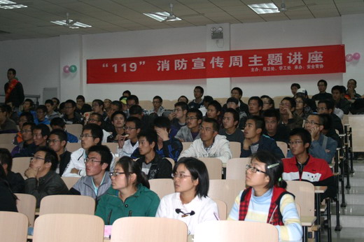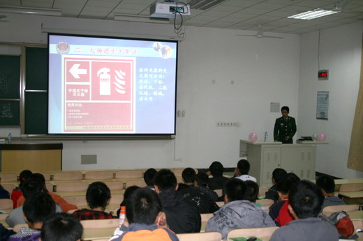在讲座中,苏磊首先对近年来各地区各种类型的火灾做了简短的概括,并就自己的工作经验对各种情况的火灾进行了详细的举例说明。随后,苏队长通过播放一系列的火灾现场录像和动画生动地向同学们阐述了火灾对于社会的极大危害性。与此同时,苏队长还指出近年来火灾事故频发的主要原因依旧是人们普遍对火灾认识不足与人们消防意识淡薄,并总结了“熟悉环境,牢记出口”、“扑灭小火,惠及他人”、“不入险地,不贪财物”、“善用通道,莫入电梯”等十句自救口诀,以此指导大家如何在火灾现场中及时的逃生与自救。
