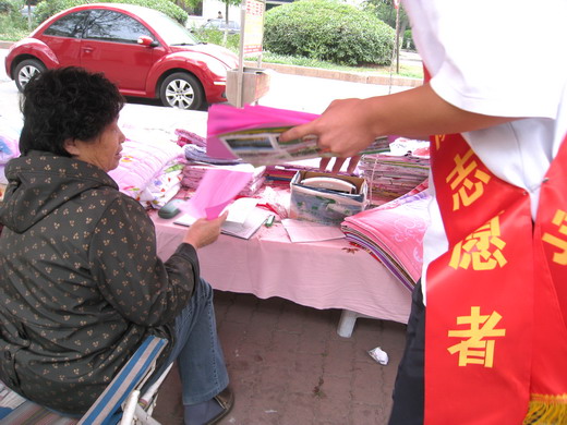 在与社区物业人员协调好后,志愿者们拉出“减灾从社区做起”的横幅,吸引了社区居民的注意。四位同学分头进行宣传,分发给社区居民宣传单,并仔细讲解为何要防灾,针对不同的人不同的环境要怎样防灾。居民们对于防灾减灾知识的宣传相当认欢迎,并积极询问志愿者自己困惑的地方。最难得的是一位年过八旬手脚都已不灵便的老奶奶从志愿者手中接过宣传单,仔细阅读后,主动向志愿者咨询疑问,得到解答后满意地离开。