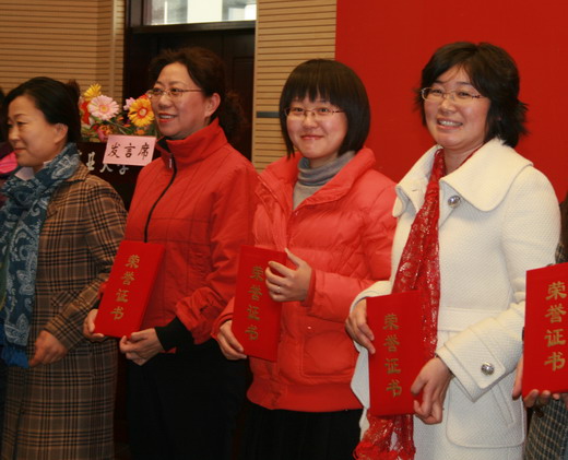 李秀老师荣获校“先进妇女工作者”荣誉称号;樊秀娟老师荣获“妇女工作积极分子”称号;张丹获得校“十佳女大学生”、唐玉华获得校“优秀女学生干部”荣誉称号。主席台领导分别向受到表彰个人颁奖。