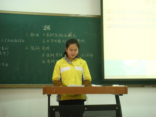 首先,班级进行入党积极分子的选举,对孙鹏飞同学成为中国共产党预备党员征集党外群众意见。班会上班长对班级上学期的工作和学习做了概括性的总结,对班级上学期的成果和不足分别加以分析。学习委员李华对上学期的学习情况作了具体分析,并与全体同学共同制定了本学期的学习规划。团支书张志勇同学则是对班级举行过的活动进行了点评,如班级趣味运动会等活动。班会上张晶晶、向贤伟等五位同学分别对自己的学习方法及经验作了分享。自由发言环节,各位同学畅所欲言,讲出了自己的心声和感想。