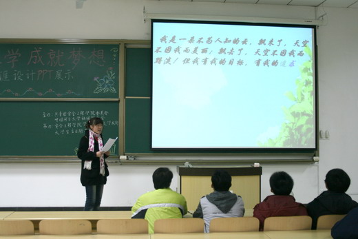 在此次展示中,参赛选手有大一的新生也有大二的同学,不同的经历让他们的展示也富有与众不同的个性。大一的同学在展示中以华丽的幻灯片效果、富有激情的音乐为在场观众展示了一个个初入大学的学子对自己的认识、对大学生活的思考以及对美好未来的向往。大二的选手多用风趣幽默的语言和较为成熟的见解总结了自己大一的生活,分享了自己的经验教训,提出“学习”这一内容的重要性,并为大一的同学提出了不少建议。回首过去的同时,他们也为自己未来三年做出了详实的规划。选手们在展示自己精美的幻灯片的同时,也与观众进行了深入地沟通。